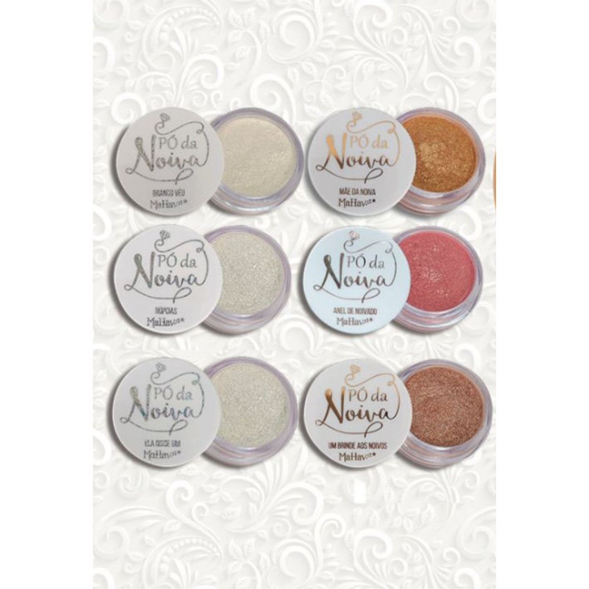 O Pó da Noiva é um pó iluminador composto por um “blend” de pigmentos puros e nobre, perolizados e micronizados, com micropartículas intensas de brilho que aderem com facilidade na pele, oferecendo um lindo fundo de cor #puroluxo, e que podem ser usadas tanto no corpo como no rosto e olhos, possui super pigmentação além de uma iluminação surpreendente!!