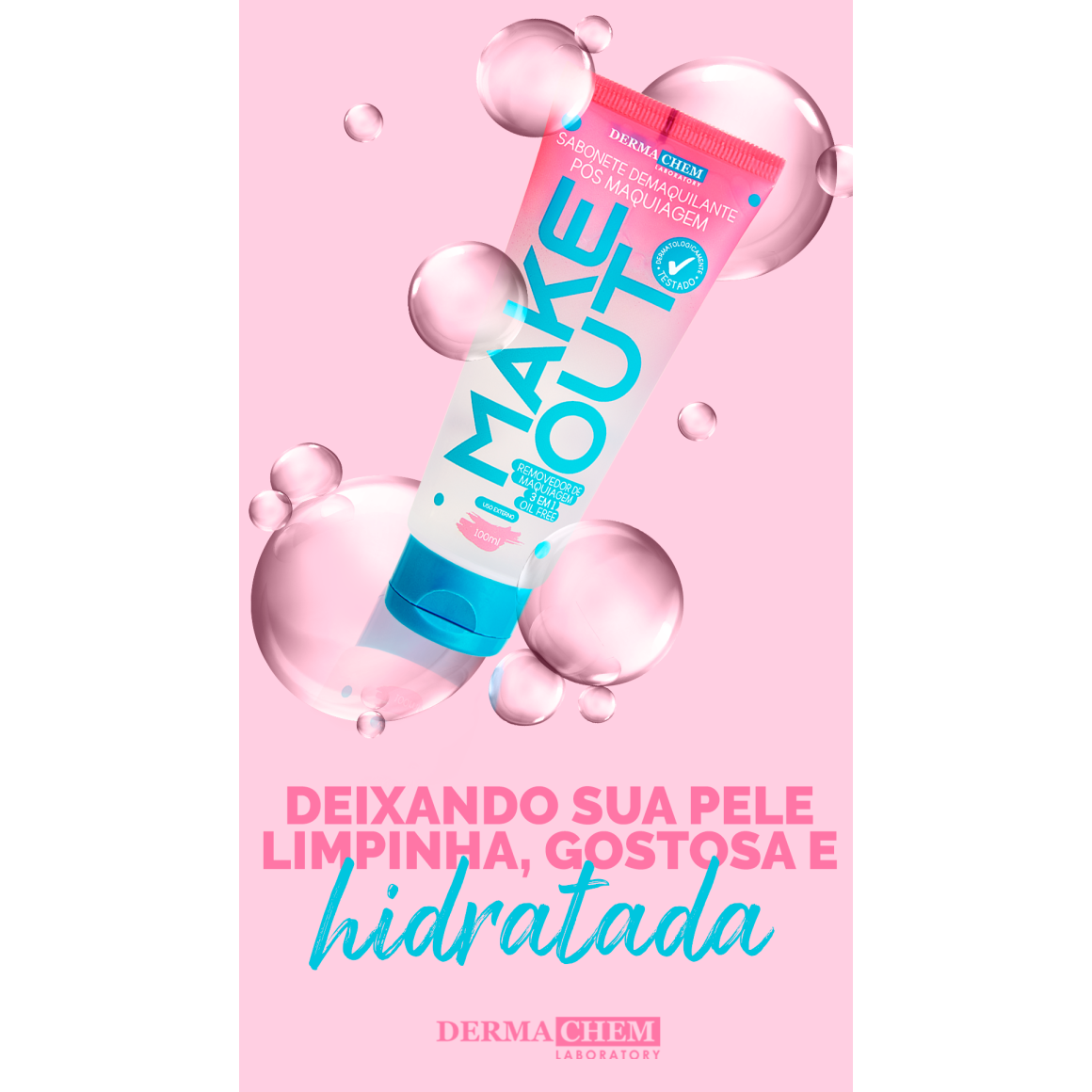 O Sabonete Demaquilante Make Out da DERMACHEM foi desenvolvido com duas tecnologias de última geração que proporcionam a remoção da maquiagem rápida e eficiente 3 em 1. Podendo ser usado de 3 maneiras práticas: 1ª demaquilante de banho, usar durante o banho; 2ª demaquilante lavabo, usar lavando o rosto na pia e 3ª demaquilante tradicional usando um disco de algodão ou bastonentes. Foi reunido uma inovação em demaquilante facial Oil Free, que utiliza meio totalmente aquoso, não pefajoso, para remoção de maquiagem pesada, onde o produto ao mesmo tempo em que remove a maquiagem, limpa o rosto e resíduos. Este produto foi desenvolvido para proporcionar conforto e praticiddae ao dia a dia, seja ele usaod durante o banho, lavando o rosto na pia ou simplesmente utilizando algumas gotas no algodão. Vale lembrar que para maquiagens a prova d'água em alguns casos seja necessário aplicar o produto mais de uma vez ou remover pequenos pontos com ajuda de algodão. Possui também pH equilibrado e adequado para região facial.