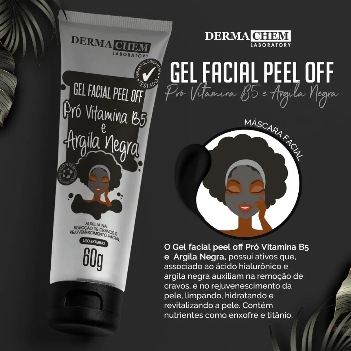 O Gel facial peel off Pró Vitamina B5 e Argila Negra Dermachem Laboratory possui ativos que, associados ao ácido hialurônico e à argila negra, auxiliam na remoção de cravos, no rejuvenescimento da pele, limpando, hidratando e revitalizando-a. Contém nutrientes como enxofre e titânio.