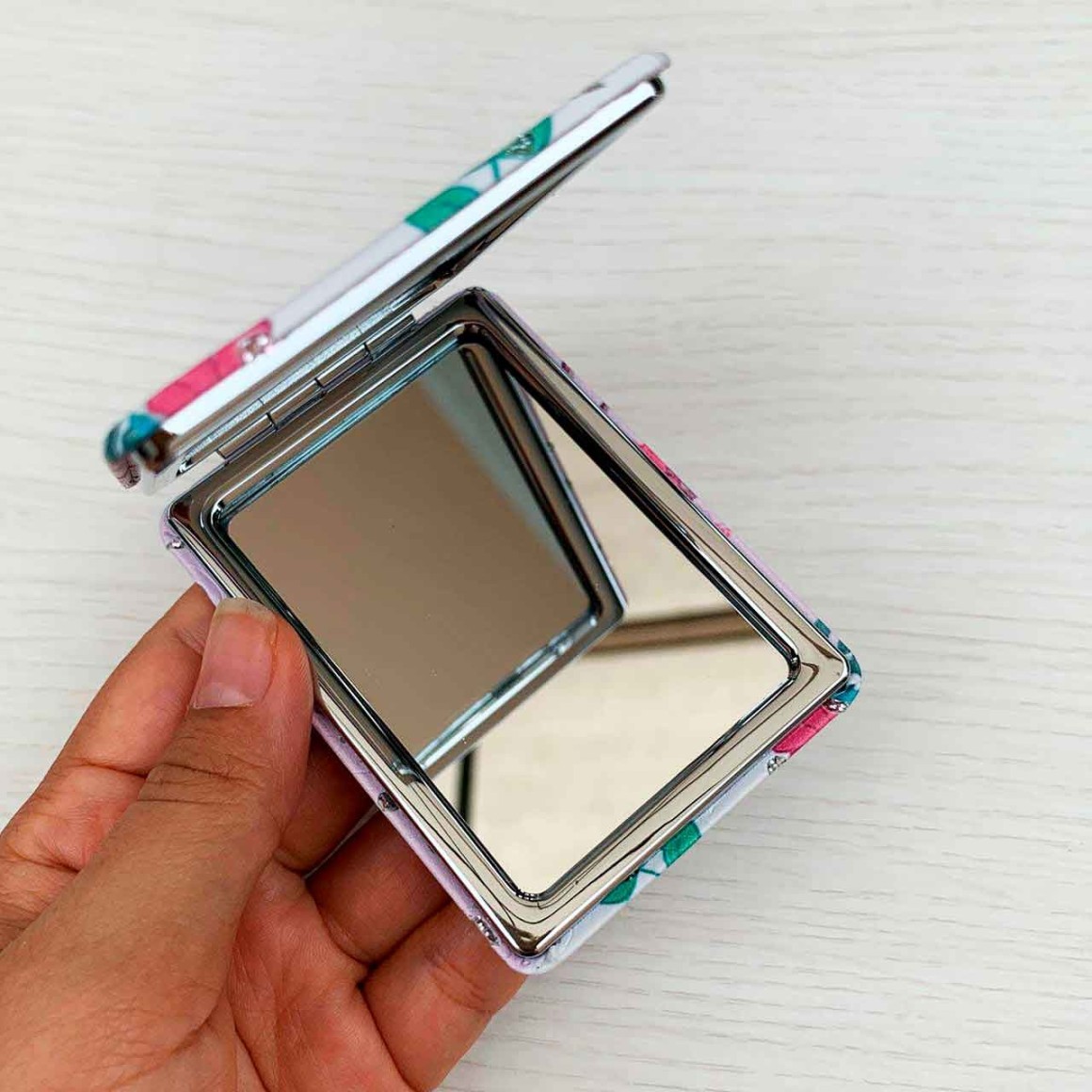A embalagem, além de linda e compacta, possui dois espelhos, um comum e outro com lente de aumento.