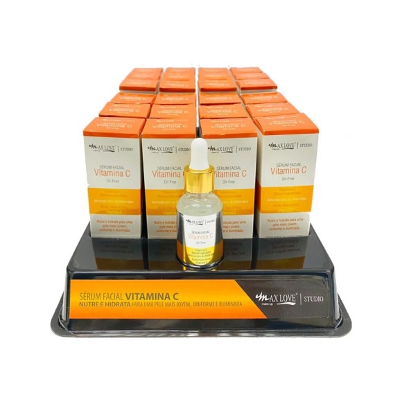 Box 24 Sérum Vitamina C Max Love O Sérum facial Vitamina C da Max Love nutre e hidrata a pele, deixando-a com aspecto jovem, uniforme e iluminada. Pode ser usado antes da maquiagem ou na hidratação noturna. Dermatologicamente testado. Oil-free ( não oleoso)