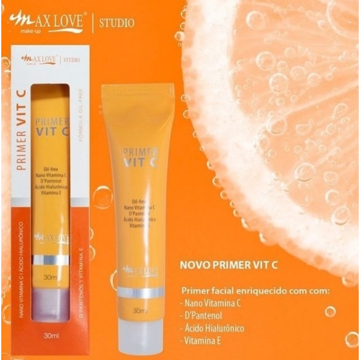 Primer VIT C Max Love é enriquecido com Nano Vitamina C, D'Pantenol, Ácido Hialurônico e Vitamina E. Prepara a pele para receber a maquiagem entregando os benefícios da ação antioxidante e hidratante.