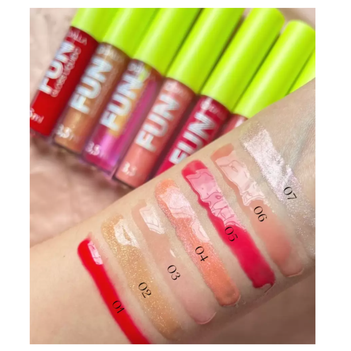 E a Linha Girls Just Wanna Have Fun da Dalla acabou de crescer e ficar ainda mais completa e divertida. A linha vem toda em cores neons, o que a faz inesquecível! O Gloss Fun da linha Girls Just Wanna Have Fun Dalla vem disponível em 7 cores lindíssimas, que vão trazer o brilho que faltava na sua make. A fórmula possui um brilho perfeito, textura em gel que não gruda e durabilidade é fantástica! E além de tudo isso, é cheia de ativos que mantém a hidratação para lábios em dia.