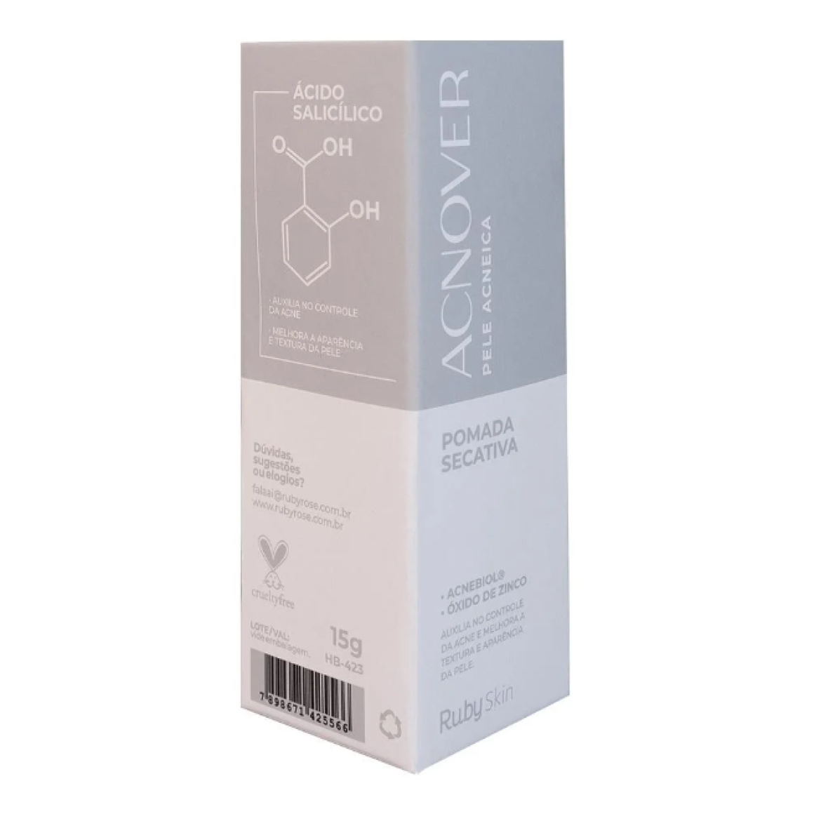 A Pomada Secativa Antiacne Acnover foi desenvolvida especialmente para acne, formula com complexo Bio-Normalizador composto por Ácido Salicílico fundamental para combater a acne e melhorar a aparência e textura da pele, Salicilato de Dimetilsilanodiol com ação queratolítica, purificante e suavizante, Acetilmetionato de Zinco com ação sebo-reguladora e nutritiva, os Extratos de Aloe e Pepino atuam como agentes hidratantes, reparadores, calmantes e refrescantes, Extrato de Lúpulo e Limão, auxiliam a normalizar a oleosidade excessiva e Pantenol com ação protetora e hidratante, e Óxido de Zinco que atua reduzindo a oleosidade. Livre de parabenos.