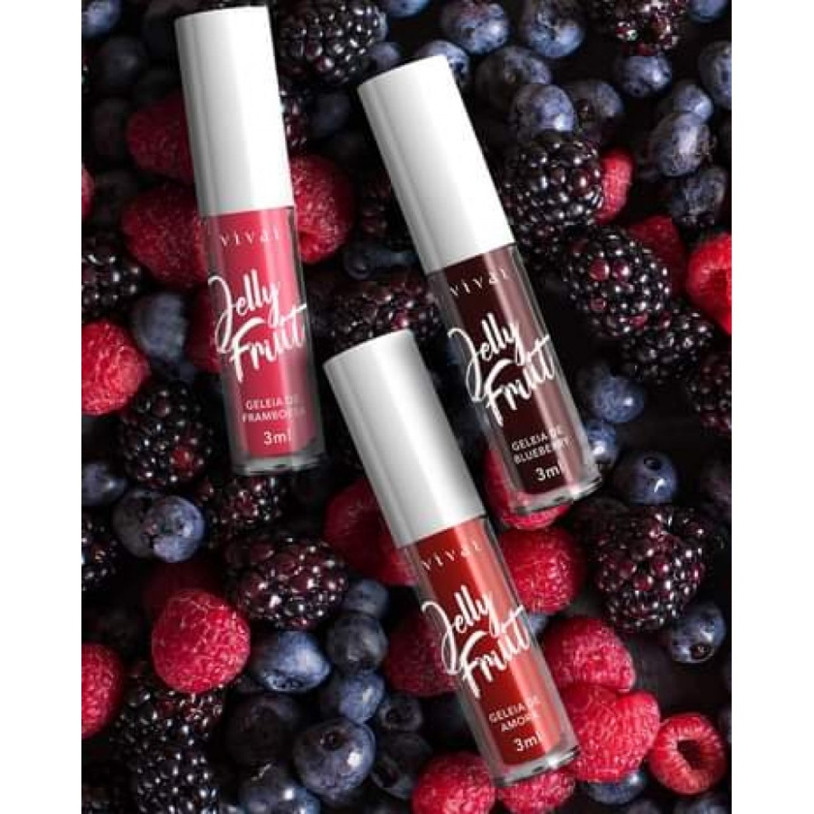 Com um toque aveludado e um cheirinho sensacional o Jelly Fruit Lip Tint Vivai vai ganhar seu coração, com os sabores de Amora, Blueberry, Cereja, Framboesa, Morango e Pitanga tem uma alta pigmentação, deixando os lábios com uma cor única e ideal para você arrasar. Uma mistura de Batom e Gloss com a pigmentação do Lip Tint.