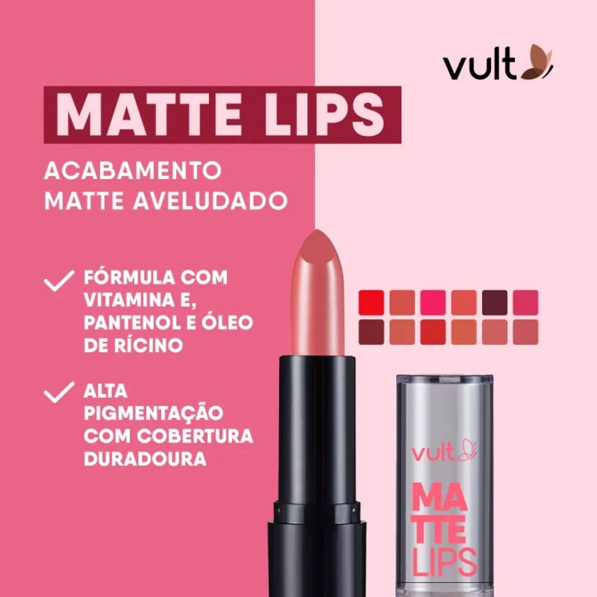 O Batom Vult Matte Lips apresenta fórmula enriquecida com Vitamina E, Pantenol e Óleo de Rícino, ativos hidratantes que deixam o efeito matte confortável nos lábios. Sua composição apresenta Tecnologia Real Color: alta pigmentação e cores fiéis da embalagem à sua pele.