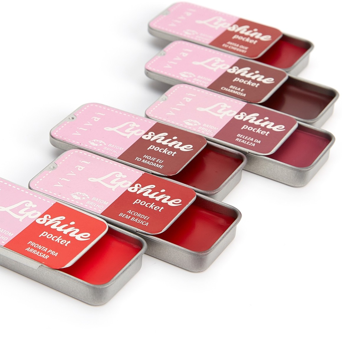 O Batom Pocket Lip Shine Vivai possui 6 cores LINDÍSSIMAS que variam entre rosa e vermelho, ambas prometem hidratar e pigmentar, deixando seus lábios ainda mais lindos e prontos pra qualquer ocasião. Ele possui um brilho perfeito e uma embalagem feita de lata super fofa, que serve pra você levar pra qualquer lugar e também pra deixar de enfeite na sua penteadeira!