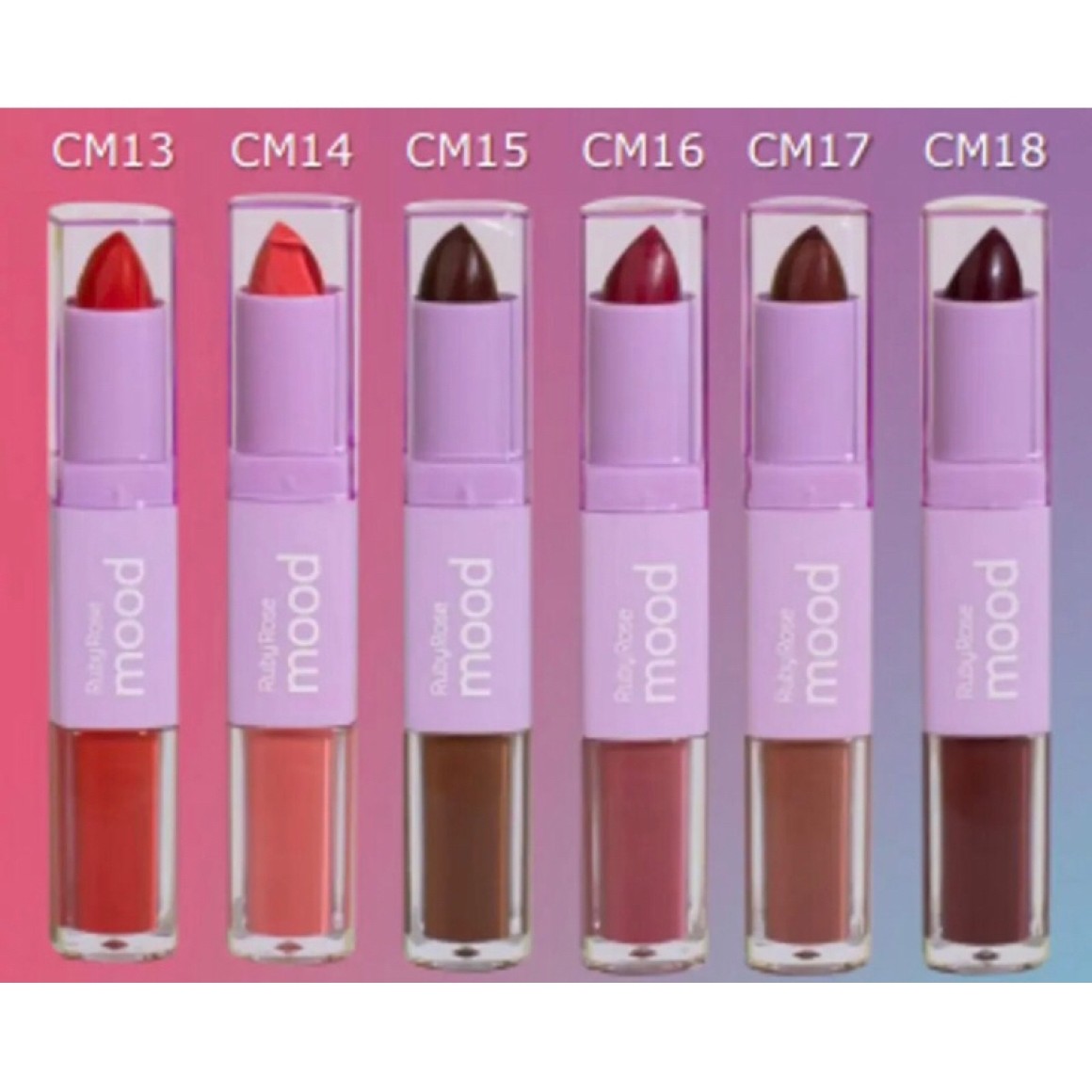 A nova linha de batons duo Mood da Ruby Rose possuem excelente cobertura, toque sedoso, um cheirinho maravilhoso e longa duração! Além de deixar os lábios lindos e confortáveis, ainda cuida dos lábios, pois possui em sua formulação a Vitamina E para auxiliar no cuidado com a pele deles.