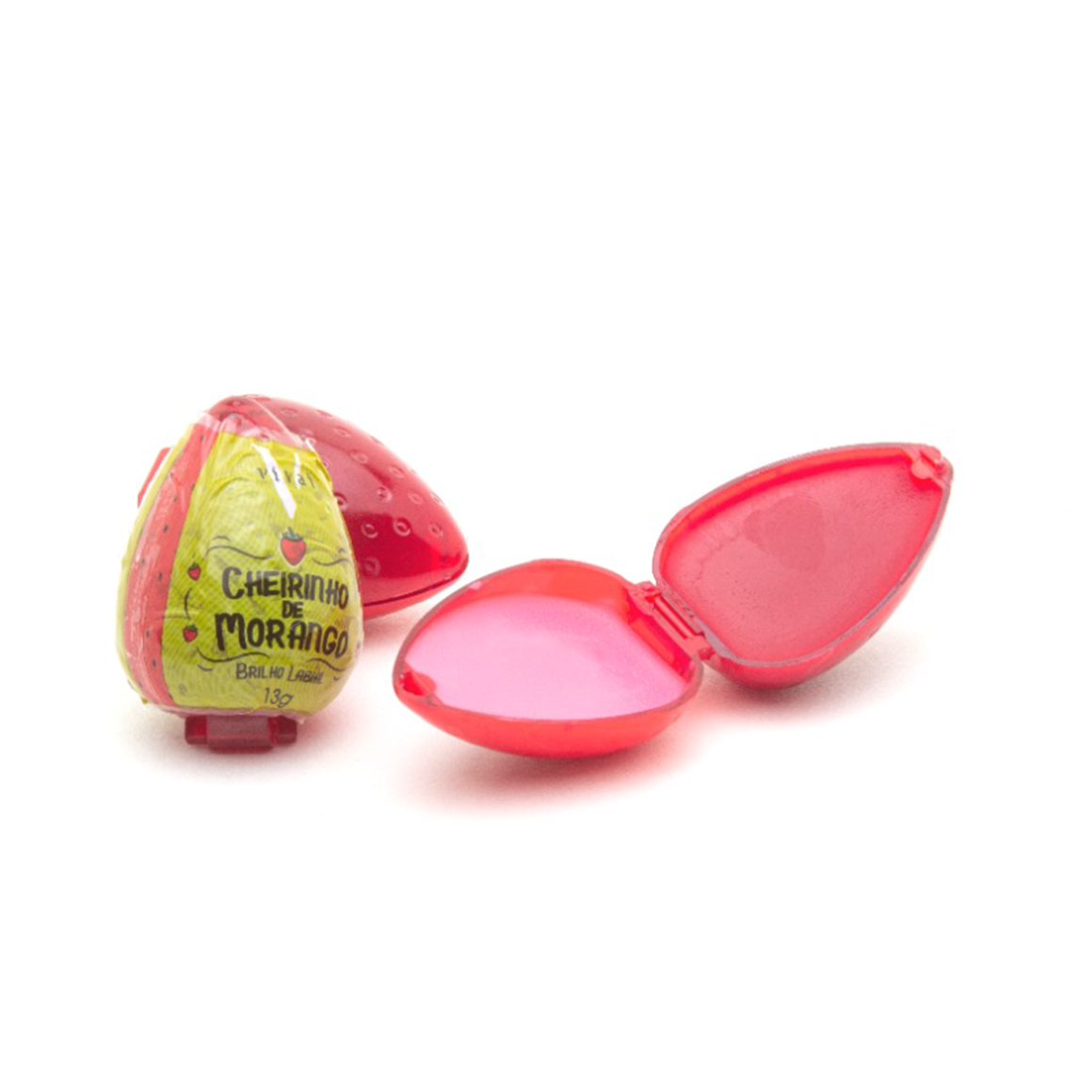 O Brilho Labial Cheirinho de Morango da Vivai está disponível em sua linda embalagem no formato morango. Possui 2 cores: de um lado rosa e do outro vermelho.