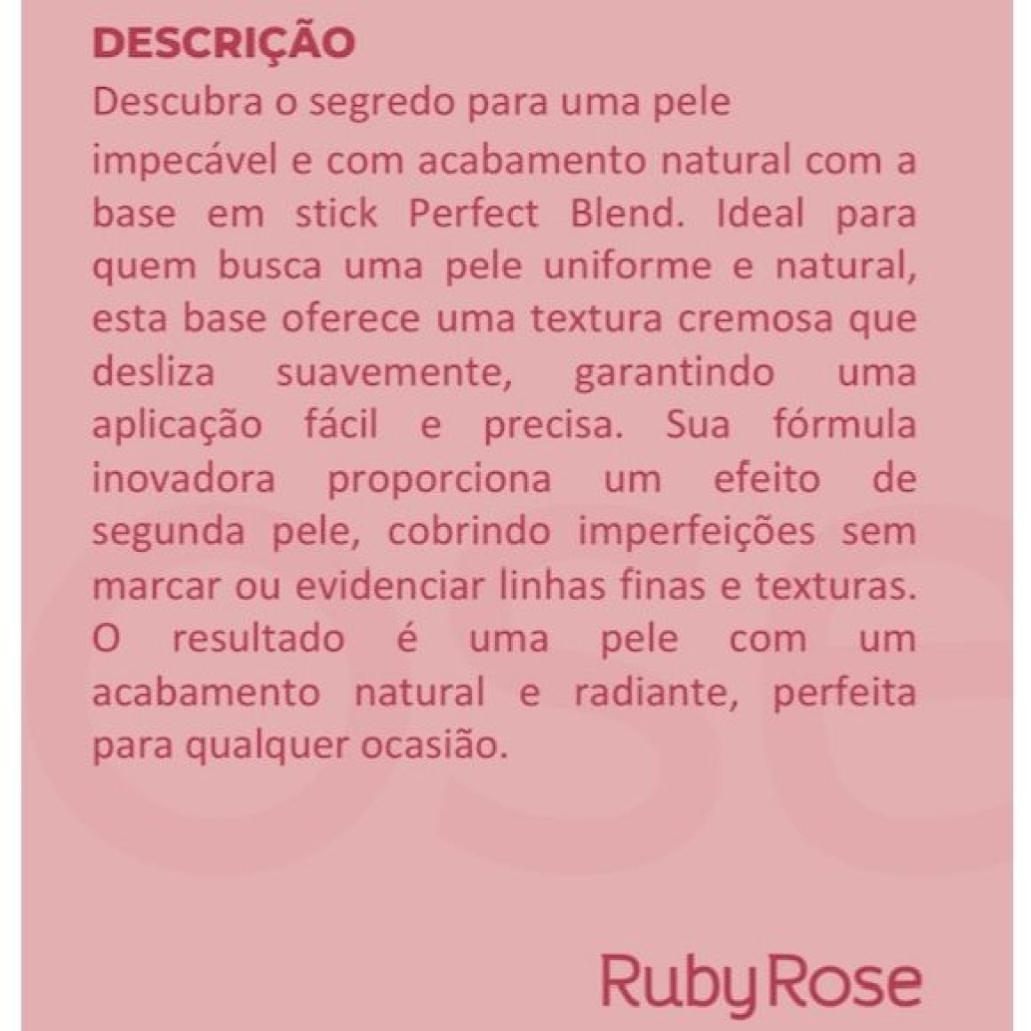 A Base Em Stick Perfect Blend da Ruby Rose é a solução ideal para quem busca praticidade e alta cobertura em um único produto. Com fórmula leve, ela proporciona um acabamento natural e uniforme na pele. Tem textura cremosa que desliza suavemente, Aplicação fácil e precisa. Fórmula inovadora proporciona um efeito de segunda pele, cobrindo imperfeições sem marcar ou evidenciar linhas finas e texturas.