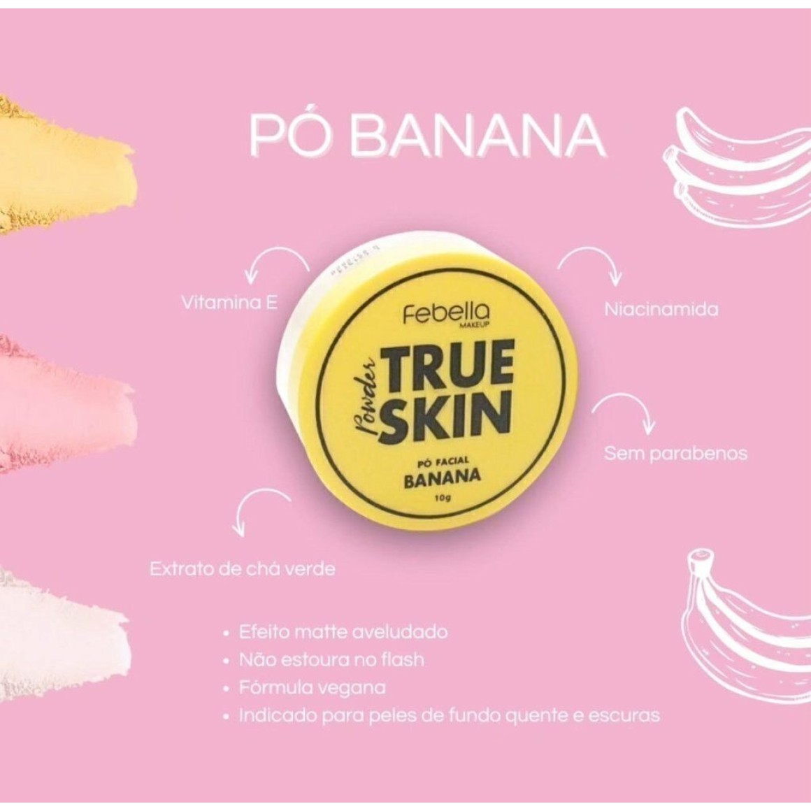 O Pó banana é ideal para matificar todos os tipo de pele. Sua textura é super fina e ajuda a não acumular nas linhas de expressão. Super fácil de aplicar e o MELHOR de tudo, não estoura na foto. Além de selar e matificar a sua maquiagem prolonga sua make por mais tempo! Desenvolvido para todos os tipos de pele, atendendo as diferentes tonalidades e características. Usado para finalizar a maquiagem e torna-la mais duradoura, possui ingredientes especiais para matificar a pele e deixá-la aveludada, proporcionando um acabamento HD. Não reflete luz forte e nem estoura no flash.
