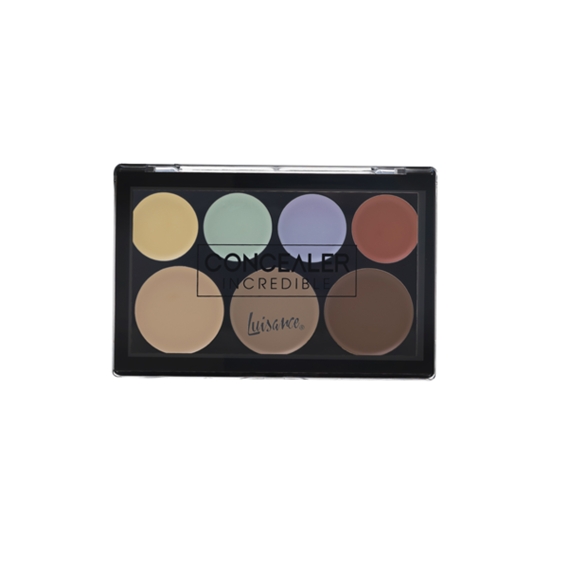 A paleta de corretivos cremosos Incredible Concealer da Luisance possui tons para contorno e cobertura e possui também 4 tons de corretivos coloridos que servem para: