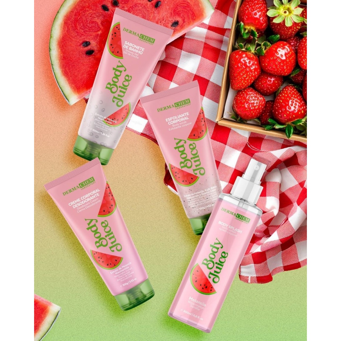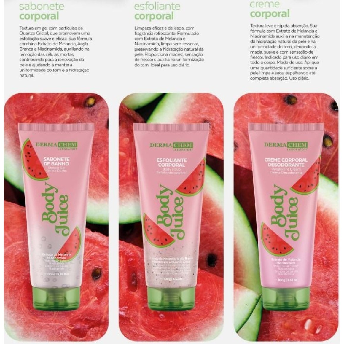 1° Sabonete de Banho – limpeza refrescante 2° Esfoliante Corporal – remove impurezas e renova a pele 3° Creme Corporal Desodorante – finalização para uma pele suave e nutrida 4° Body Juice – hidratação, maciez e perfume duradouro
